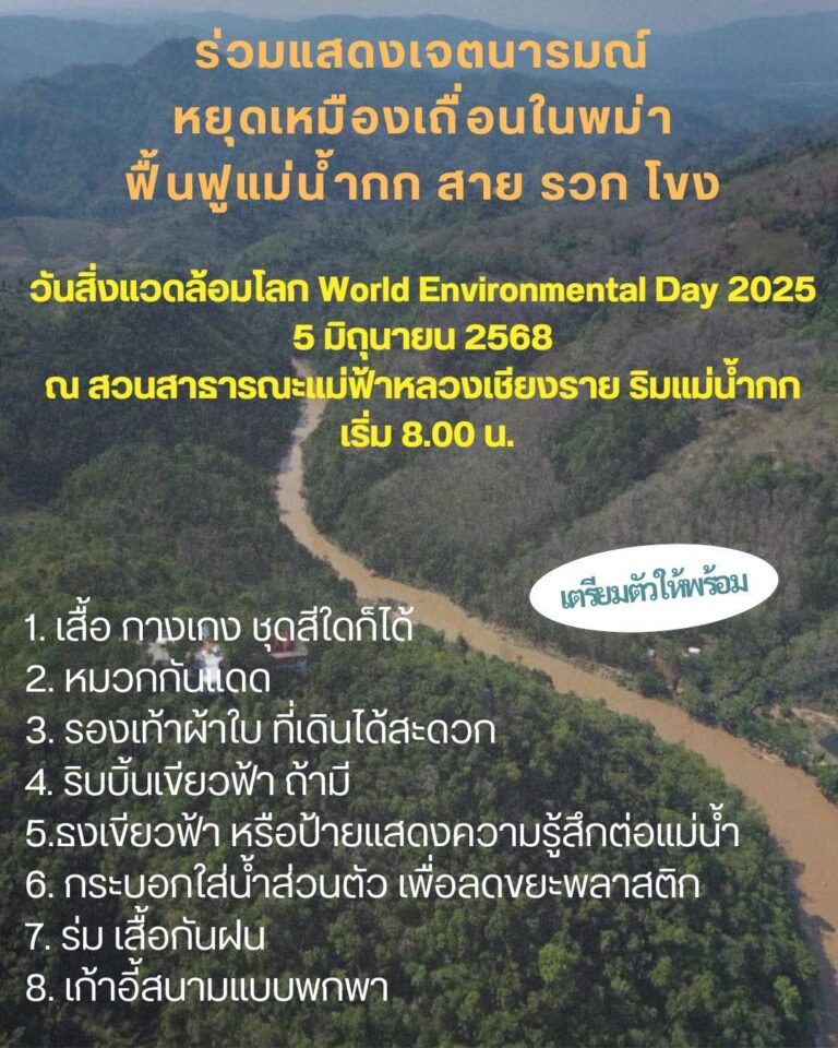 ขอเชิญ ชาวเชียงราย ร่วมแสดงพลัง และ เจตนารมณ์ หยุดเหมืองในพม่า 5 มิถุนายน 2568